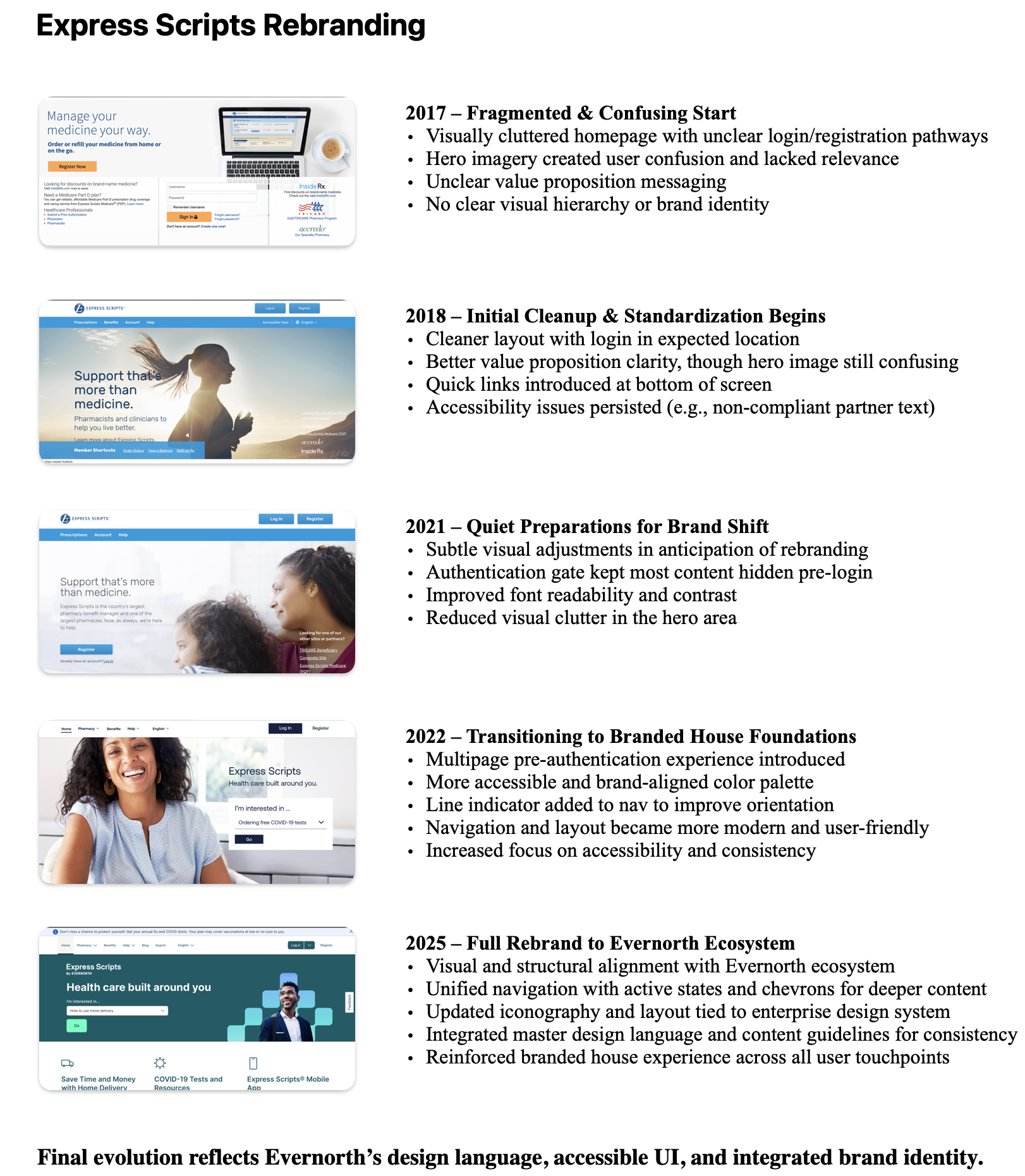 Led the UX research strategy and execution behind the rebranding of Express Scripts and the co-branding of TRICARE, then guided the multi-year effort to transition Accredo, eviCore, MDLIVE, and other child brands into a cohesive Evernorth identity grounded in user trust and system-wide clarity.